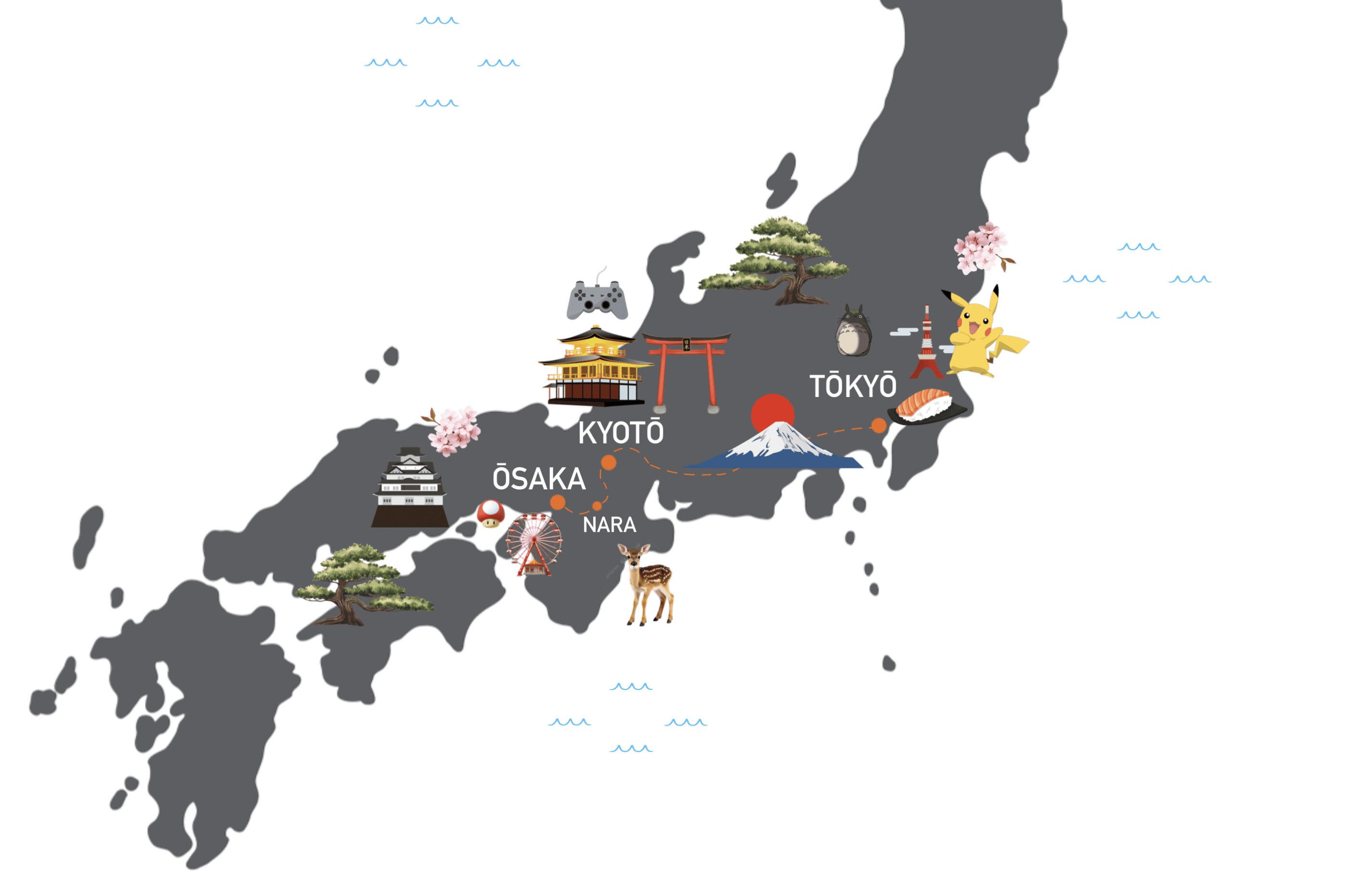 Sur cette carte, vous pouvez voir en détail notre itinéraire de 2 semaines au Japon. Nous avons atterri dans la ville de Osaka (vol direct depuis Paris avec Air France) et sommes repartis ensuite de Tōkyō à l’issue du séjour. À la fin de cet article, je vous ai rassemblé tous les points et lieux d’intérêt dont je vous parle ici dans une carte interactive Google Maps pour vous aider à mieux préparer votre propre itinéraire au Japon.