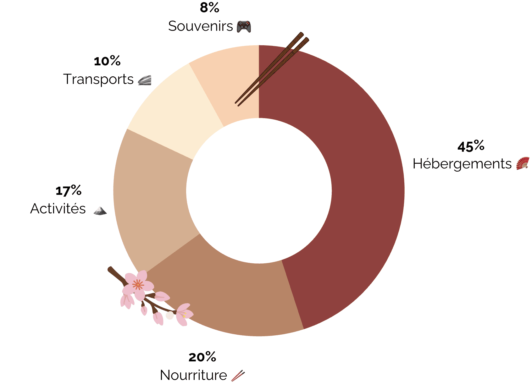 Au total, nous avons dépensé environ 2800€ pour deux personnes, soit 1400€ par personne pour l’ensemble du séjour sur place — hors vols internationaux. Ce budget correspond à un voyage confortable, avec quelques expériences typiquement japonaises. Les principales dépenses de notre itinéraire au Japon se répartissent ainsi :